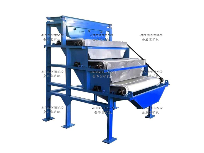 分选流程:矿浆经上部给矿后,先通过磁筒除去强磁性铁质,再经三个强磁辊逐级分选弱磁性矿物,精矿与尾矿通过可调分隔板分离。