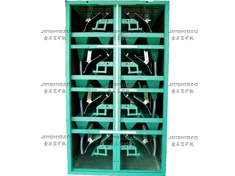 本机采用双排四层结构,每层都有接地弧形溜板(无锈钢制),其上部安装一弧状带高压静电板(铝板制),此电极板固定不动(但可调),在接通高压静电后,矿物经下矿板溜至接地弧板进入高压电场区,导电矿物被感应而带电,吸向电极,但由于受到重力作用,故它的运动轨迹不同于非导体矿而从前方排出,非导体矿也受到电场作用,但不会被吸引而进入下层再分选,复选四次直至矿产品合格。